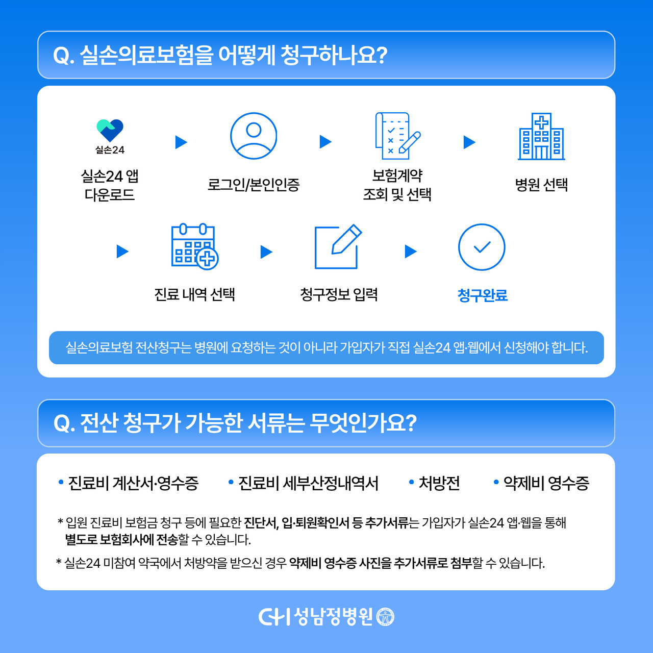 성남정병원은 환자분들의 편의를 높이기 위해 실손24 전산청구 서비스를 시행하게 되었습니다. 이제 병원에서 종이서류를 발급받아 별도로 제출하지 않고, 실손24 앱·웹을 통해 실손보험 청구를 직접 진행하실 수 있습니다. 실손24 이용방법 실손24 앱 다운로드 > 로그인/본인인증 > 보험계약 조회 및 선택 > 병원 선택 > 진료 내역 선택 > 청구정보 입력 > 청구완료! 전산 청구 가능 서류 • 진료비 계산서·영수증 • 진료비 세부산정내역서 • 처방전 • 약제비 영수증 * 실손24 미참여 약국에서 처방약을 받으신 경우 약제비 영수증 사진을 추가서류로 첨부할 수 있습니다. 의료기관 진료기록 조회 기준 조회일 기준 3년 이내의 진료내역(단, 실손24 시행일인 '24.10.25. 이후부터 조회 가능) 자세한 문의는 실손24 고객센터(1811-3000) 또는 가입하신 보험회사로 문의하시기 바랍니다. |