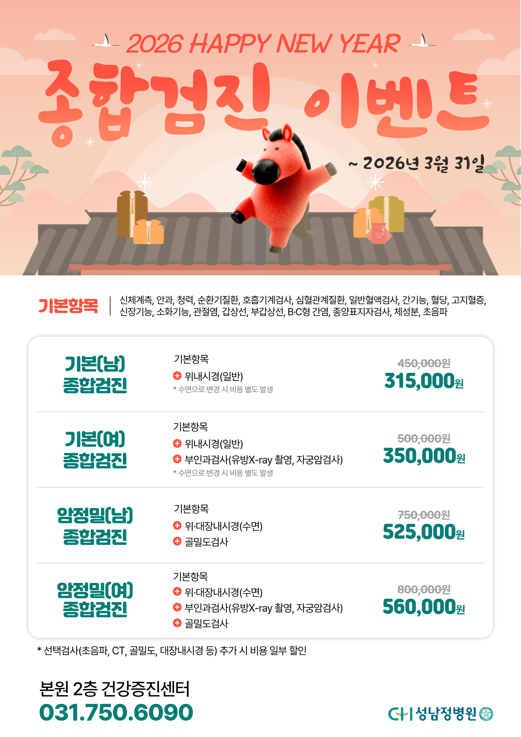 새해를 맞아 성남정병원에서 종합검진 이벤트를 준비했습니다~! 건강한 한 해의 시작, 성남정병원과 함께하세요. [기간] 2026년 3월 31일까지 [검진 프로그램 및 이벤트가] ▸기본(남) 종합검진 : ▸기본(여) 종합검진 : ▸암정밀(남) 종합검진 : ▸암정밀(여) 종합검진 : ※ 선택검사 추가시 일부 할인 적용 가능 [문의 및 예약] 본원 2층 건강증진센터 031-750-6090 / 홈페이지 예약 바로가기 |